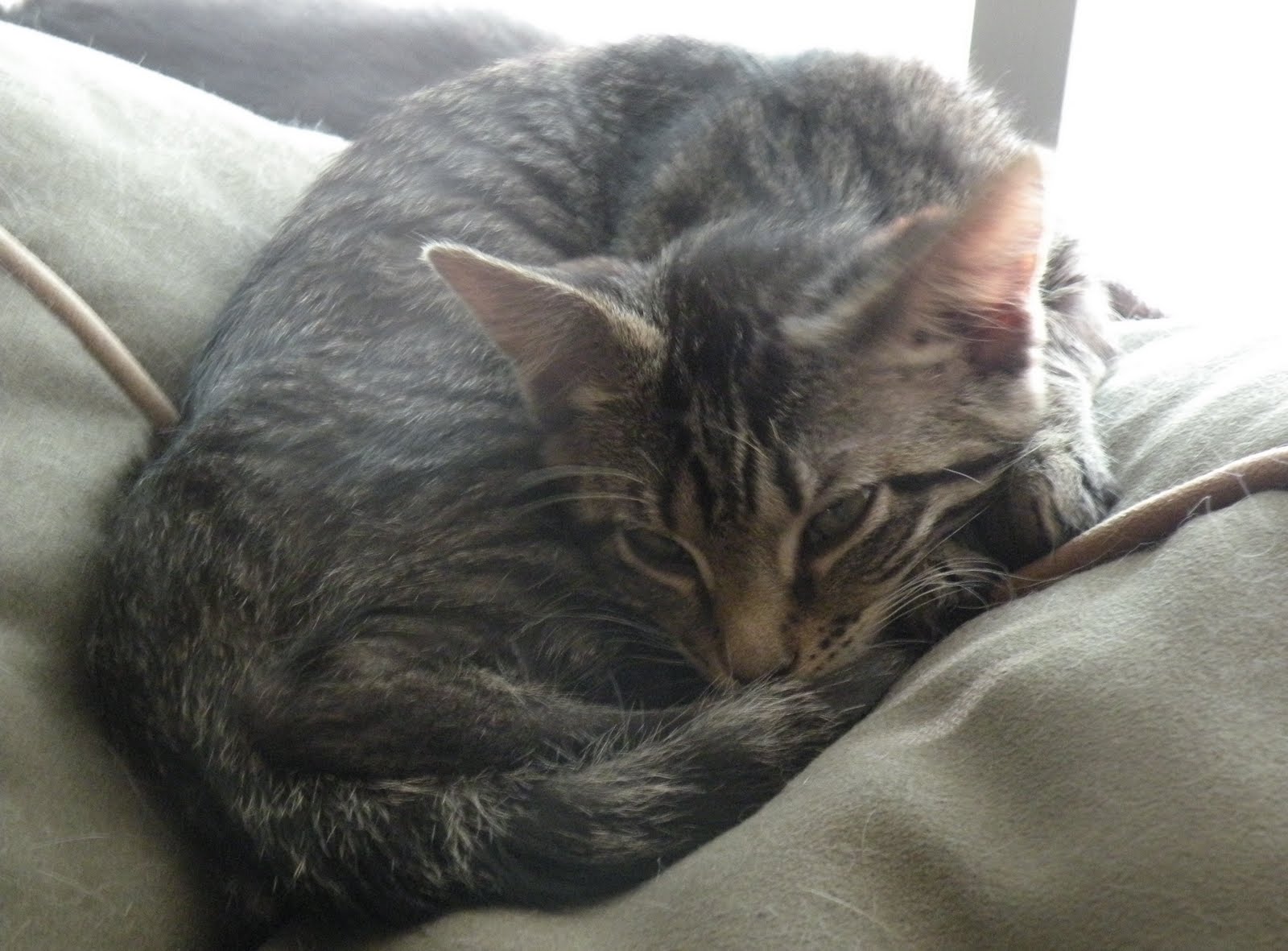 Sure enough, sitting on the curb was a small kitten looking at me. I went back to the car to get a can of cat food, because again... a crazy cat lady is always equipped with cat food. That's the first thing you learn in Crazy Cat Lady 101. I dumped the food on the curb and she ate the whole thing as I petted her. She started purring and rubbing on me, so I picked her up, got into the car, and took her home. A few days later I took her to get spayed and get ready for adoption through a local rescue group. But as soon as she was going to make her debut at the adoption center, she came down with what I thought was a URI (Upper Respiratory Infection), so she had to stay home and go on antibiotics.